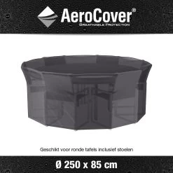 De AeroCover Tuinsethoes 250 x 85 antraciet is perfect voor een ronde tuintafel met stoelen met een totale diameter van 250 centimeter. De ademende AeroCover stof is waterbestendig, reduceert condensvorming en gaat schimmelvorming tegen. Het rijgkoord met twee stoppers zorgt voor een goede bevestiging. De hoes wordt geleverd inclusief handige opbergtas.
