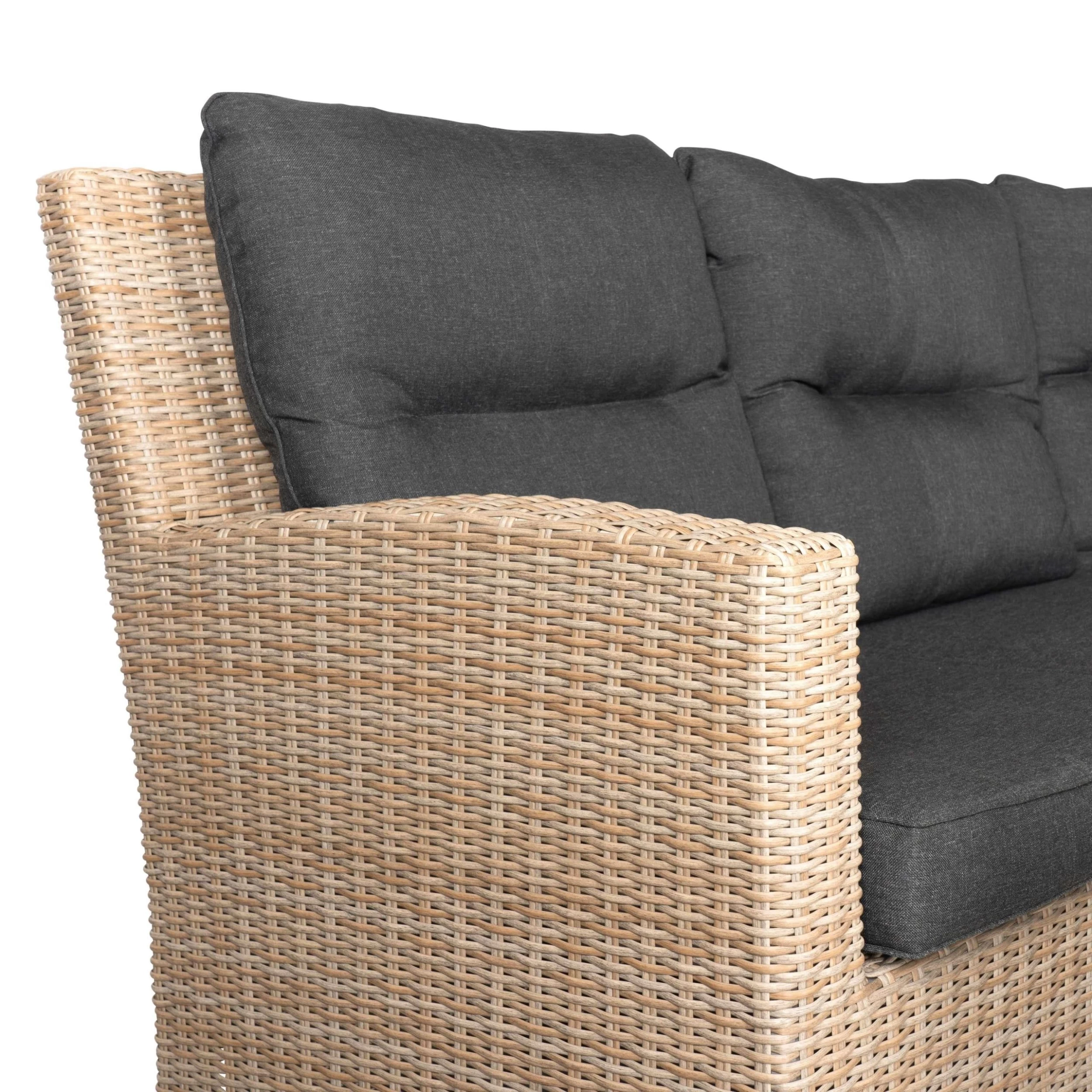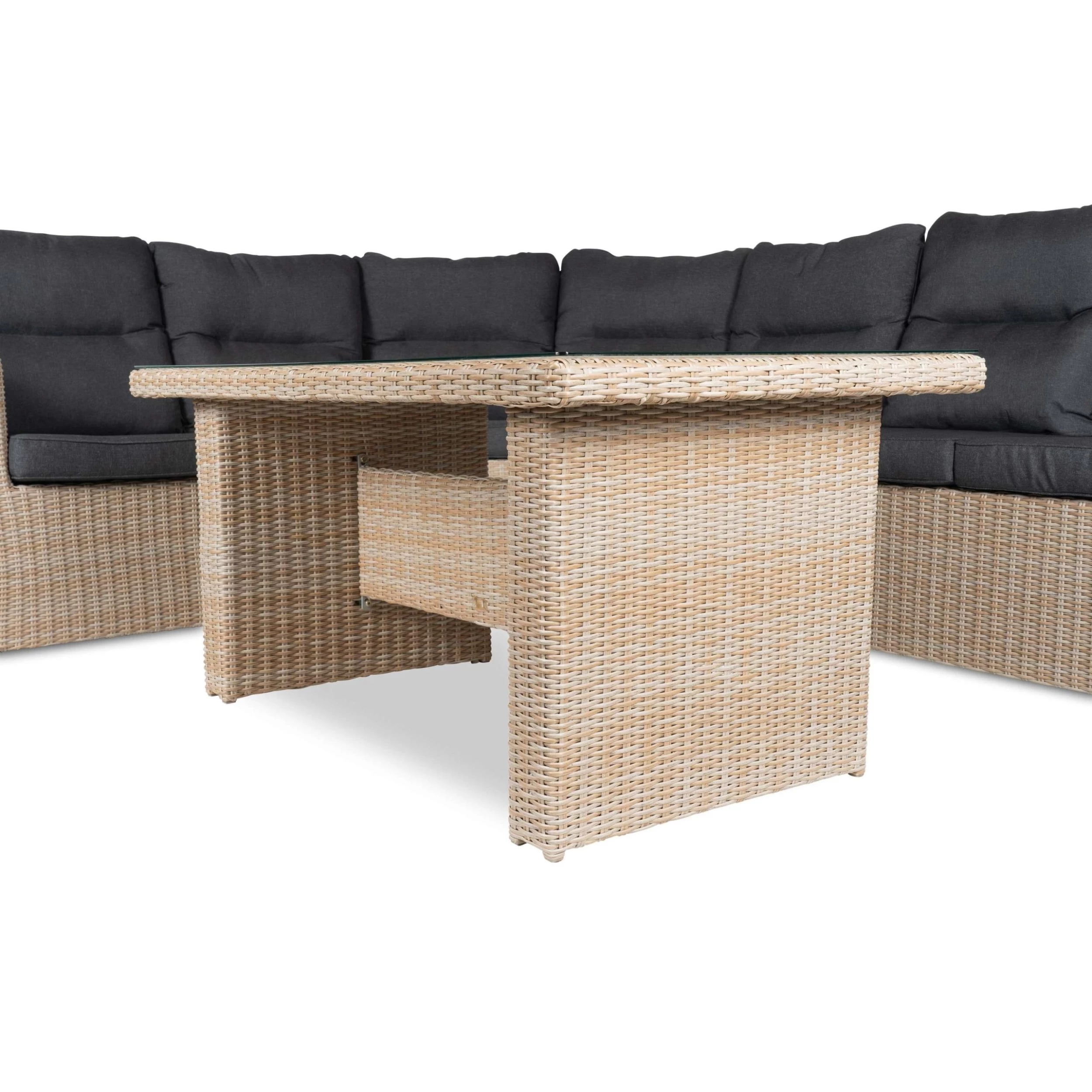 De Bardani Eldorado loungeset is een ruime loungeset gemaakt van stevige en weersbestendige materialen. Er is genoeg ruimte voor 5 à 6 personen. De set bestaat uit een grote hoekbank en een tuintafel. Alle onderdelen hebben een aluminium frame en een afwerking van wicker-vlechtwerk. De set heeft een los tussenstuk waardoor de lange zijde van de bank zowel links als rechts geplaatst kan worden. De hoekbank is voorzien van comfortabele zit- en rugkussens. De tafel heeft een glazen tafelblad, waardoor het een stijlvolle uitstraling krijgt. De afmetingen van de tafel zijn: 146 x 80 x 67 cm.