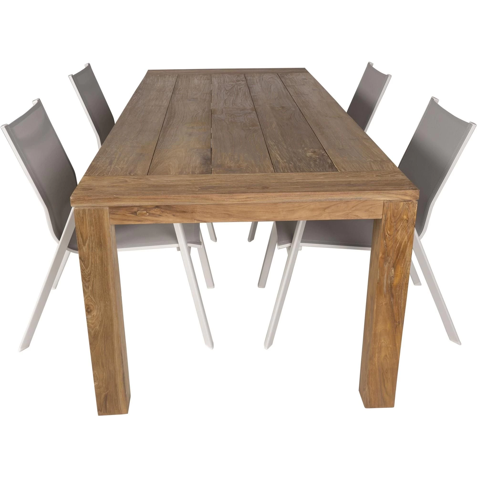 De Bardani Roma 240 Aruba 4 tuinset is geschikt voor vier personen. Deze Bardani tuinset bestaat uit vier Aruba dining stoelen en de Roma tuintafel van Bardani. Ondanks zijn lengte van 240 centimeter is deze tafel door het gebruik van teakhout uiterst stevig en stabiel. De poten en blad zijn beide volledig massief afgewerkt. Teakhout staat er bekend om dat het zeer duurzaam is. Het is niet gevoelig voor rot en bestand tegen vele weersomstandigheden. De minimalistisch vormgegeven Aruba dining stoelen zijn ook weerbestendig door het gebruik van aluminium en textileen. De stoelen zijn tevens ook stapelbaar, ze nemen dus weinig plaats in als ze opgeborgen moeten worden.