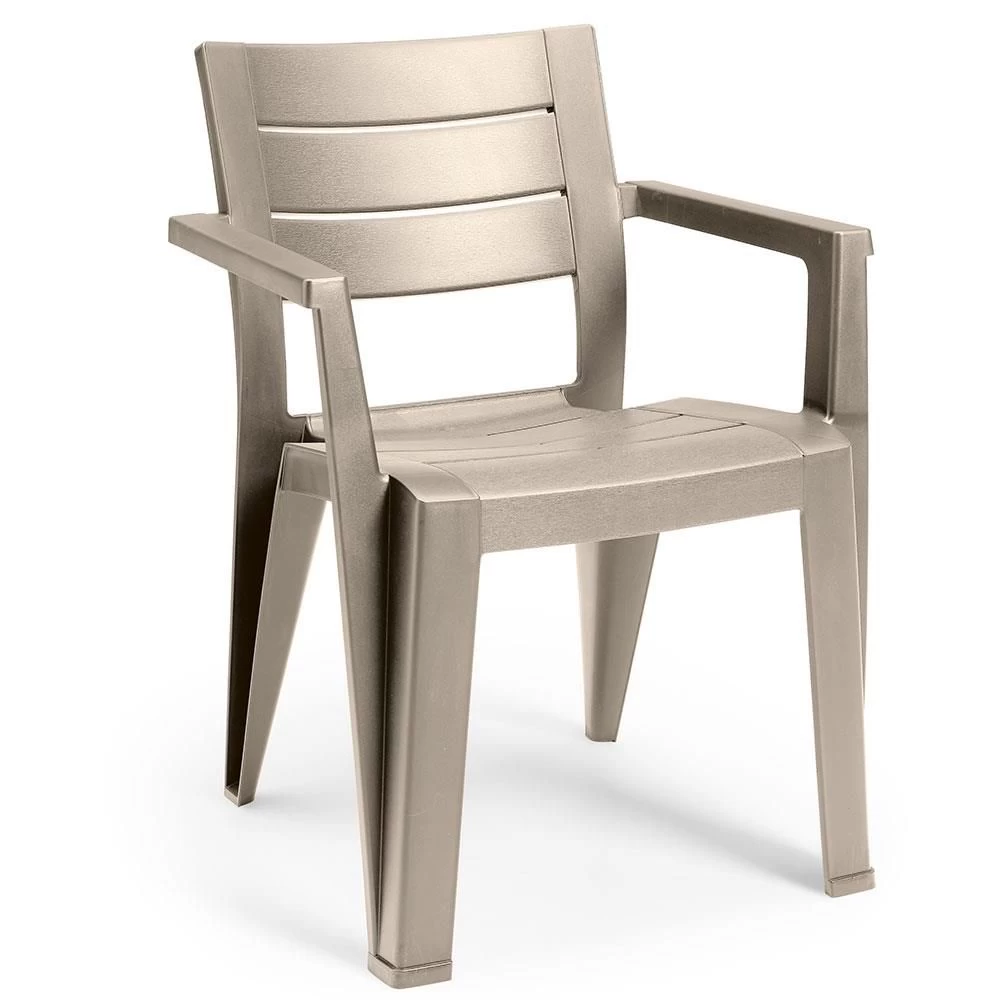 De Keter Julie stapelbare tuinstoel in de kleur cappuccino biedt prettige zitcomfort. Deze tuinstoel van Keter heeft een houtlook afwerking en bestaat uit duurzaam kunststof. Daarnaast is de stoel weer- en waterbestendig maar ook zeer onderhoudsvrij.
