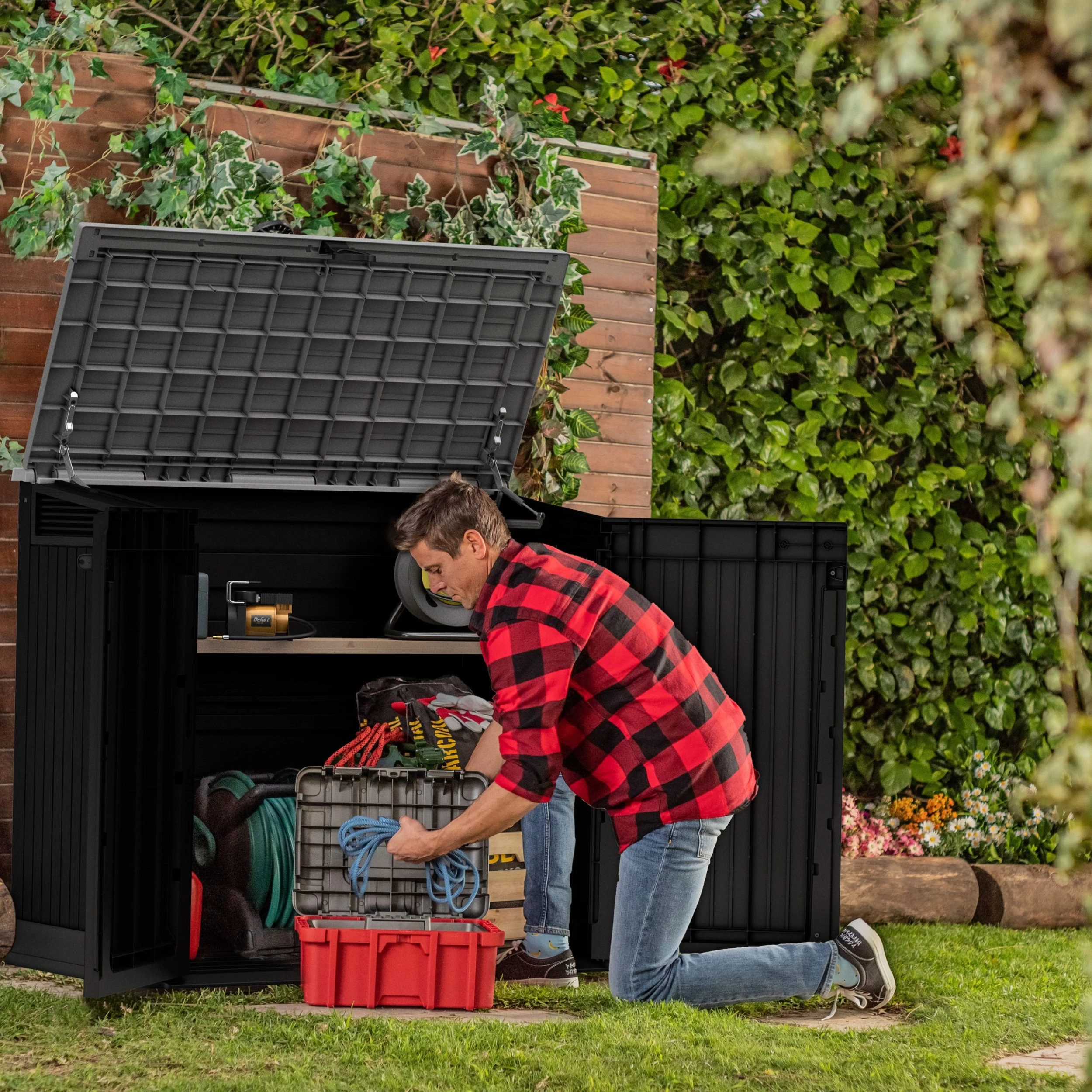 De Keter Store-It-Out Midi opbergbox biedt een goed geventileerde opbergruimte met een inhoud van 880 liter. De opbergbox kan aan de boven- en onderkant geopend worden. Daarnaast is de box voorzien van een ingebouwd vloerpaneel om uw spullen schoon en droog te houden. Deze opbergbox van Keter is gemaakt van duurzaam kunststof met houtlook.