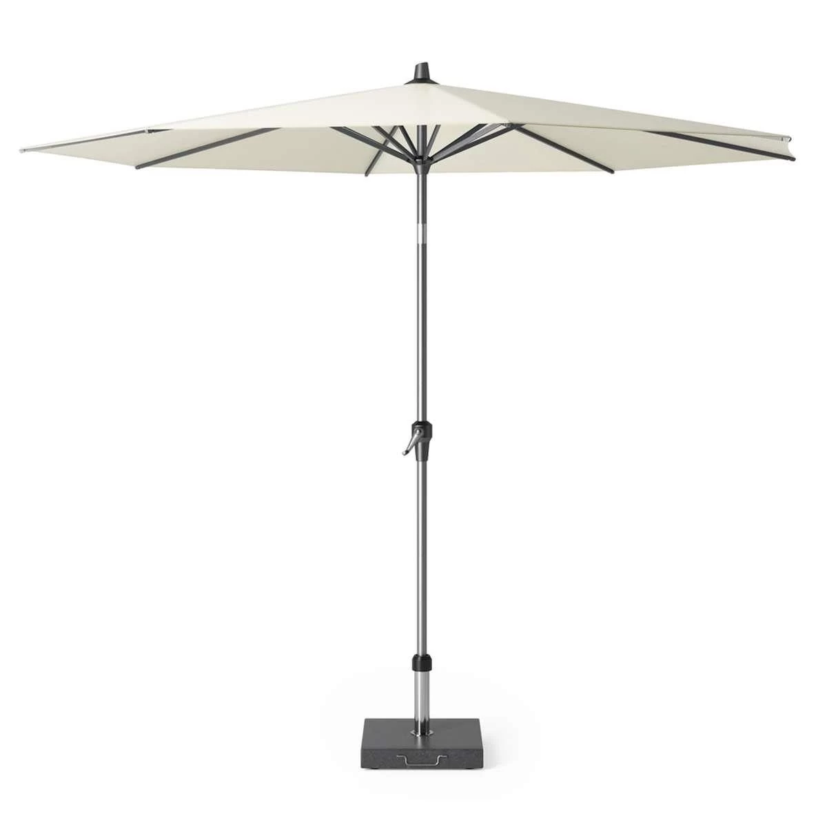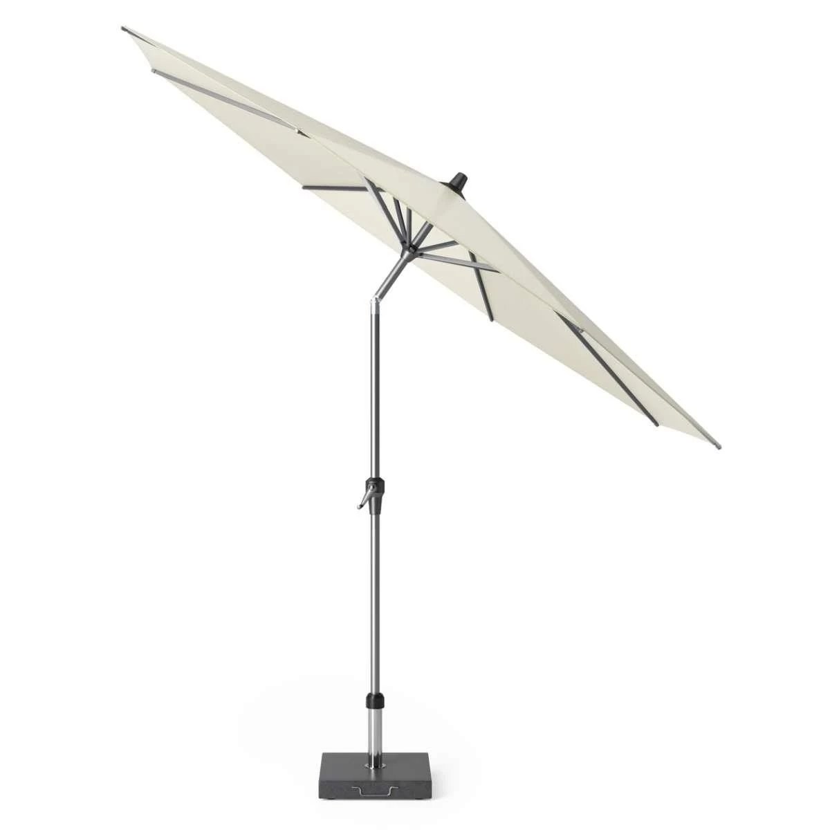 De Platinum Riva parasol is voorzien van een easy-up opdraaimechanisme, doekspanners en een stevige, deelbare mast. De parasol is uitgevoerd met een 220 grams ecru polyester doek met waterafstotende coating. Met het kantelsysteem creëert u meer schaduw in uw tuin of op het balkon. Houd uw parasol als nieuw en dek deze alleen af met een AeroCover ademende parasolhoes wanneer u deze langere tijd niet gebruikt. De parasol wordt zonder voet geleverd. Wij adviseren deze parasol op een Rome 40kg parasolvoet van Platinum te plaatsen.